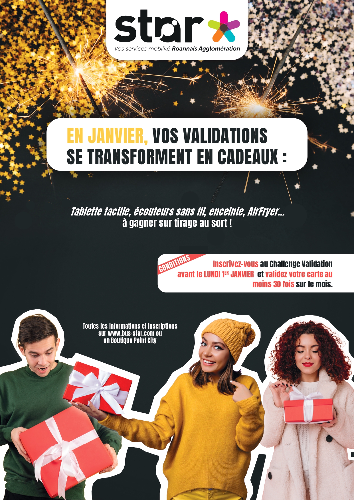 Pour participer aux tirages au sort, inscrivez-vous au Challenge Validation avant le 1er janvier et validez votre carte oùra (nominative) à bord de nos véhicules Star au moins 30 fois au cours du mois de janvier !