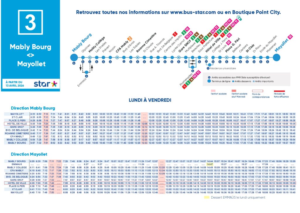 À partir du lundi 13 avril, en raison de travaux et de l’inversion d’un sens de circulation, la desserte d’Emmaüs se fera après les départs de Mably Bourg, inversement à ce qui est fait aujourd’hui.