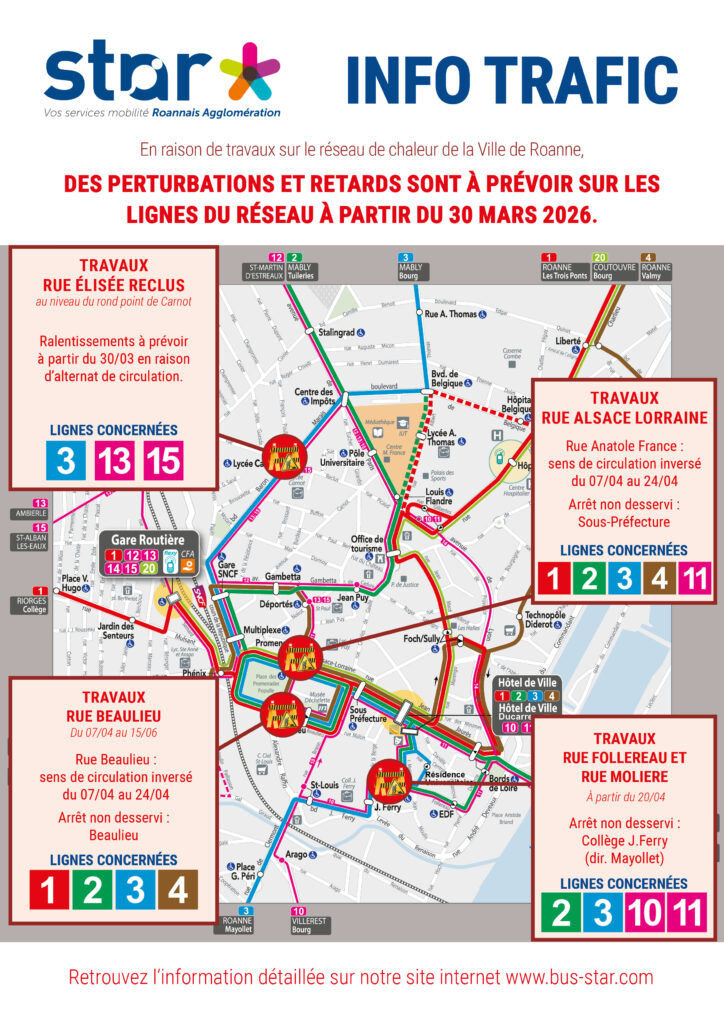 En raison de travaux sur le réseau de chaleur de la ville de Roanne, des perturbations sont à prévoir sur toutes les lignes du réseau Star.